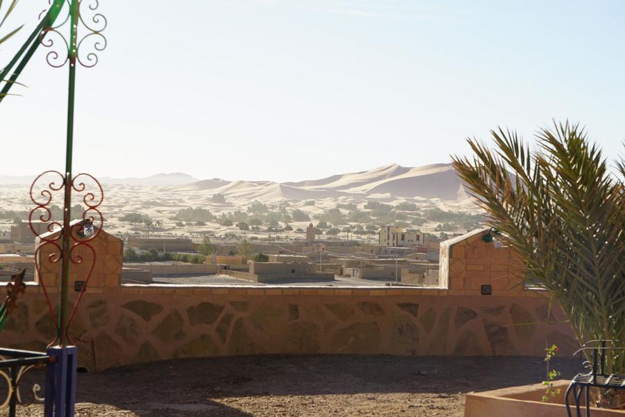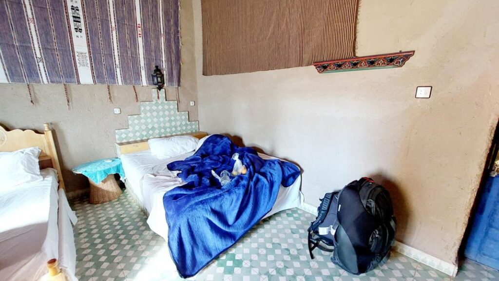 Wir wurden direkt am Flughafen abgeholt und nach einer ca. 2-stündigen Autofahrt nach Merzouga fielen wir sehr müde gegen 3 Uhr in unsere jeweiligen Betten. Überraschenderweise war ich recht früh wach und hatte Zeit, mich in aller Ruhe im Zimmer umzuschauen. Ich hatte in der Nacht kaum gesehen, wie das Zimmer aussah, in dem ich schlafen würde. Gemütlich.