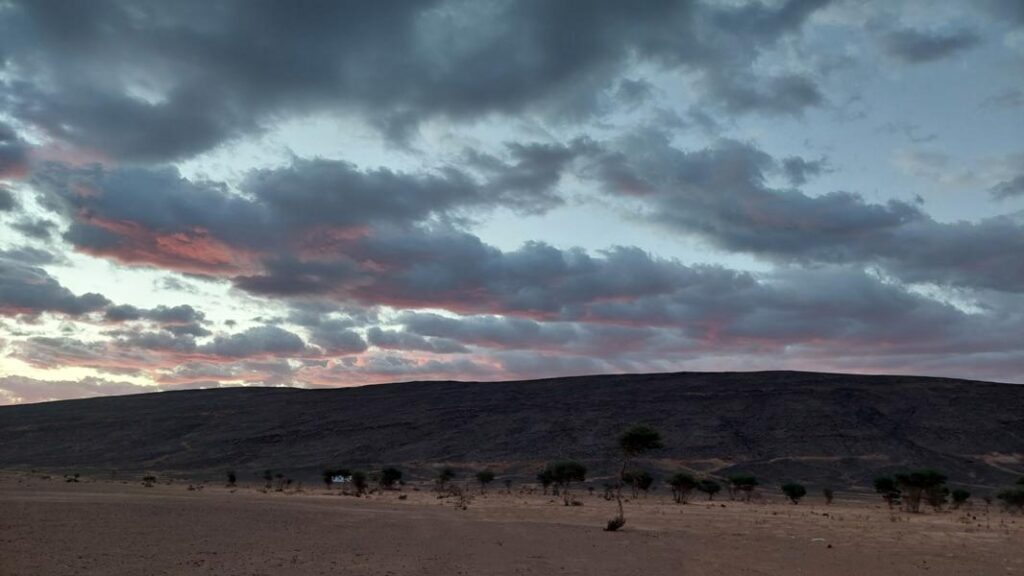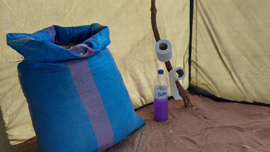 Ich bekam vor und nach der Reise viele Fragen gestellt. Einige Fragen galten der Unterbringung und Verpflegung, aber viele wollten auch wissen, wie es denn so war mit der Toilettensituation. Bei meinen vorherigen Wüstenerlebnissen wurde sich einfach hinter einen Sandhügel oder einen Busch gehockt. Und so war es auch tagsüber, wenn wir unterwegs waren. Am abendlichen Rastplatz wurde allerdings ein kleines Zelt etwas abseits vom Lager aufgebaut und darin befand sich eine Campingtoilette mit einem großen Sack Späne, Toilettenpapier und einer lilapinken Desinfektionsflüssigkeit. Auch das fand ich sehr luxuriös.