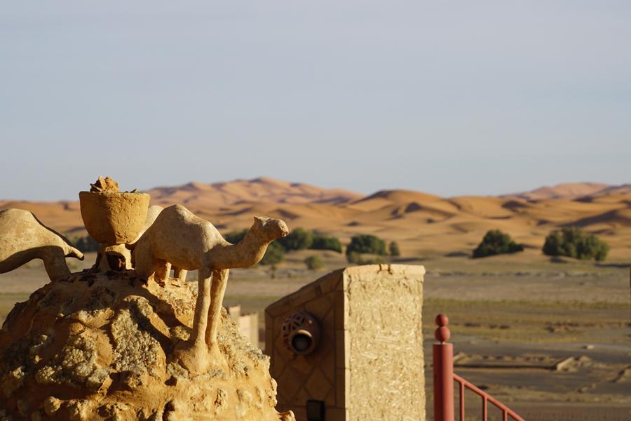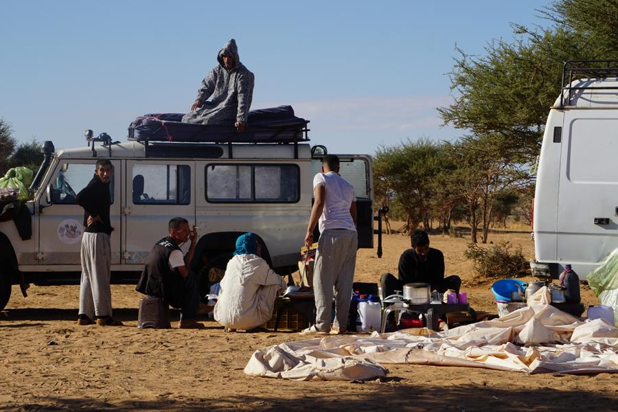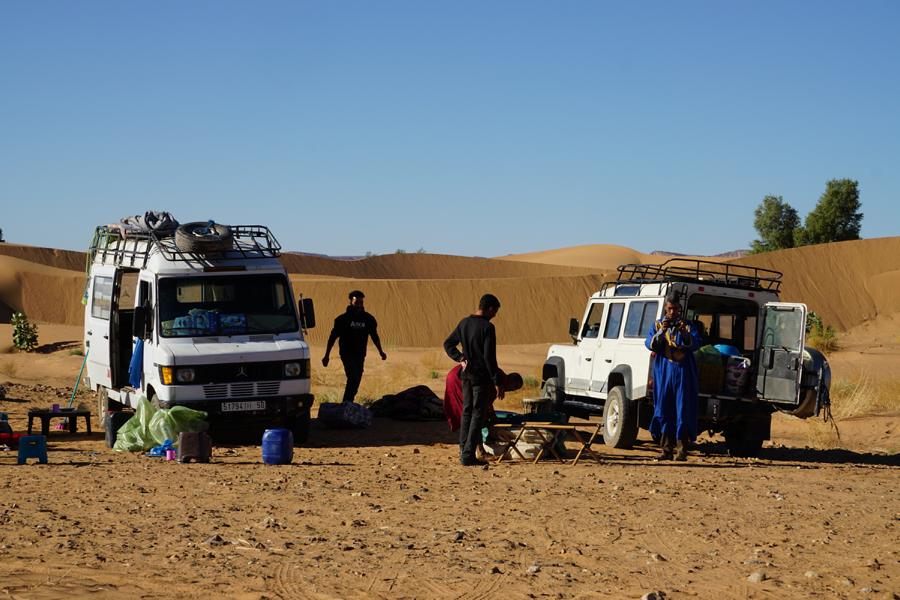 Morgenkaffee mit Blick auf die ersten Dromedare. Kurze Zeit später lief eine kleine Karawane mit lebendigen Dromedaren an den Dünen entlang.