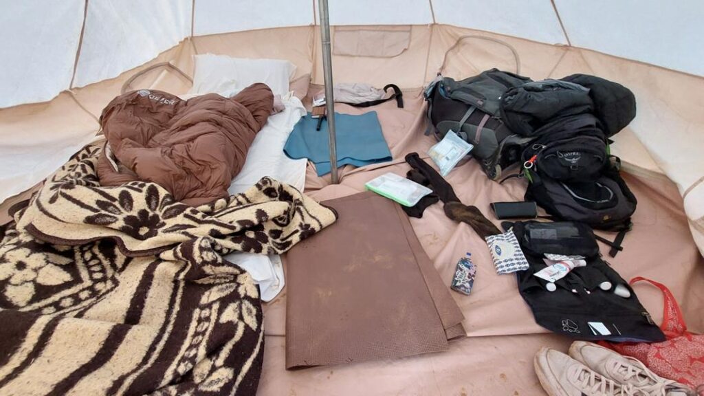 Irgendwann waren wir aber am Ziel für die erste Nacht. Wir bekamen Tee und konnten erst einmal auf dem großen Teppich herumliegen. Danach haben wir die Zelte bezogen und ich habe mich umgezogen für die Yogastunde am Abend. Eigentlich hatte ich nicht gedacht, dass ich dazu noch in der Lage wäre, aber Jenny hat auch nach dem sehr anstrengenden ersten Tag eine erfrischende und gleichzeitig entspannende Stunde unterrichtet. Kurz nach dem Abendessen lag ich gemütlich in meinem Schlafsack. Und dann gingen leider die Beinschmerzen los und nahmen sehr lange kein Ende. Keine Ahnung, was da los war, aber ich konnte vor Schmerzen nicht einschlafen. Ich wusste nicht, dass man überhaupt solche Schmerzen in den Beinen von oben, nach unten und überall, auch in den Füßen, haben kann. Leider kam ich nicht auf die Idee, mal eine Tablette zu nehmen, und schlief deshalb erst um Mitternacht ein.