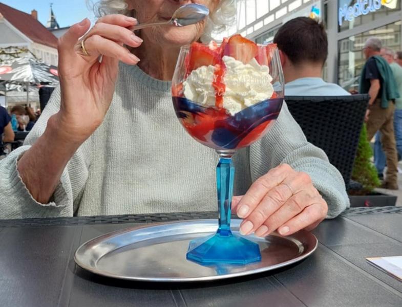 Bei Erica angekommen, habe ich alles ausgepackt und dann sind wir gleich einkaufen gefahren. Anschließend gab es für Erica einen großen Erdbeerreisbecher. Der Dialog dazu ging so: Ich: Wir könnten auch mal in eine Eisdiele gehen, statt ins Café. Erica: Na ja, Eis ist so kalt, das bekommt mir nicht so…..hmmm. Ich esse nicht so gerne Eis. Ich: Oh, das wusste ich nicht, denn in deiner Kühltruhe sind viele Eisbecher. Aber ok, du könntest auch eine Waffel essen, mit heißen Kirschen. Erica: Ja, das könnte ich. Aber wenn ich schon in der Eisdiele bin, will ich auch Eis essen. Ich: Gut, dann kannst du ja überlegen. In der Eisdiele: Erica: Ich esse eine Waffel mit Kirschen. Nein, mit Eis. Ich will keine Waffel. Was essen die dort drüben? Ich: Erdbeerbecher. Erica: Und was wollte ich? Ich: Zuerst eine Waffel mit Kirschen, dann eine mit Eis. Erica: Ich will einen Erdbeerbecher. Der wurde dann bestellt und ich fand mich diesmal wirklich total geduldig.