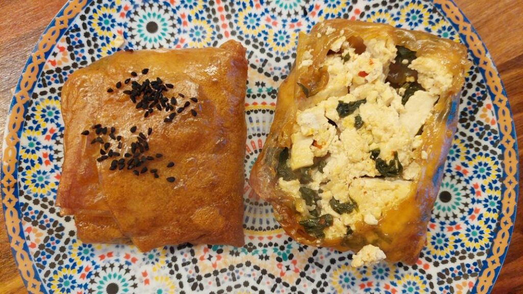 Dann habe ich noch einen Teil vom Nachmittag mit kochen verbracht. Das hier sind so Reispapiertaschen, die eigentlich dreieckig sein sollten. Gefüllt mit Tofu und Spinat und allerlei Gewürzen. Sahen von oben prima aus leider klebte der Boden am Backpapier.