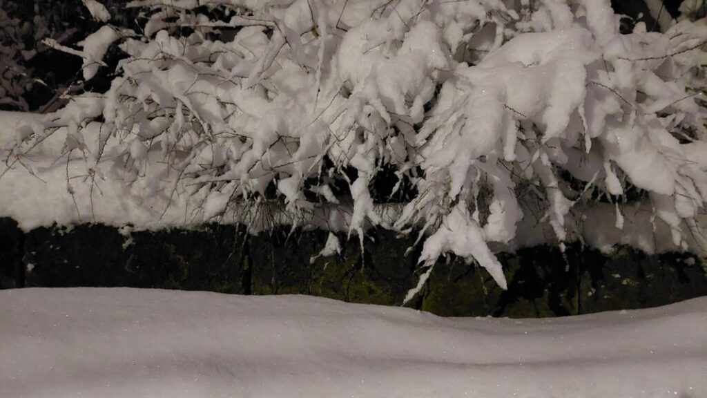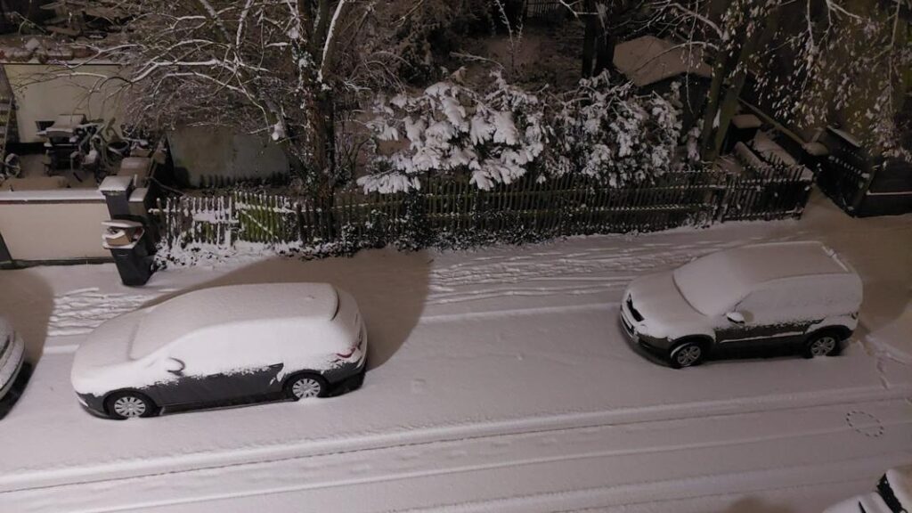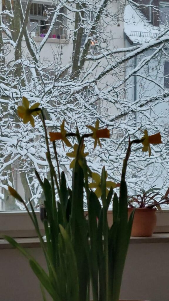Ich fuhr wieder mit der Straßenbahn zur Arbeit. Schon die ganze Woche über freute ich mich, wenn ich draußen durch den Schnee stapfen konnte und auch bei jedem Blick aus dem Fenster. Donnerstag war dann der Schneefall nochmal so stark, dass ein kleines Verkehrschaos ausbrach und beide Yoga Gruppen auf nur 4 bzw. 2 Personen zusammengeschrumpft waren.