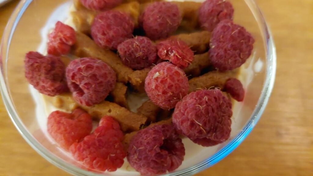 Auf dem Heimweg war es dann noch viel eisiger als am Morgen. Zum Abendessen gab es Rosenkohl auf Bohnenhumus. Und weil mich der Japanese Cheescake Hype total im Griff hat, gab es Joghurt mit Karamellkeksen und Himbeeren oben drüber. Falls jemand noch nie davon gehört hat: Durch meinen Insta Feed rollt seit letzter Woche eine große Welle mit Rezepten für Japanese Cheescake. Dabei handelt es sich allerdings nicht um klassischen Käsekuchen sondern eben um Joghurt in den Karamellkekse gesteckt und dann eine Stunde oder auch über Nacht in den Kühlschrank gestellt werden. Die Feuchtigkeit vom Joghurt zieht in die Kekse, die Kekse werden weich, der Joghurt cremig und das Ganze ist am Ende lecker.