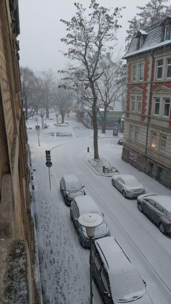 Auf der halben Strecke Straßenbahn, traf ich die Kolleginfreundin und weil die Bahn so voll war, sind wir ein Stück gelaufen.