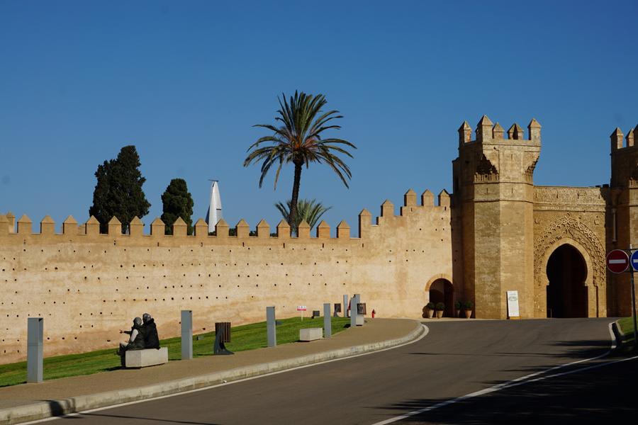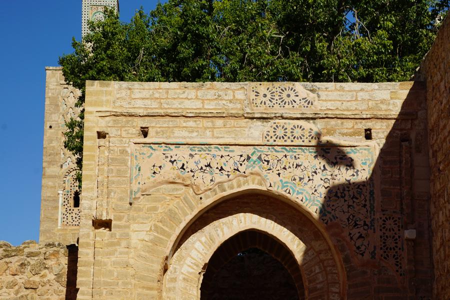 Das ist das Eingangstor der Chellah. Und links neben der großen Palme schaut der Mohammed VI Tower hervor.