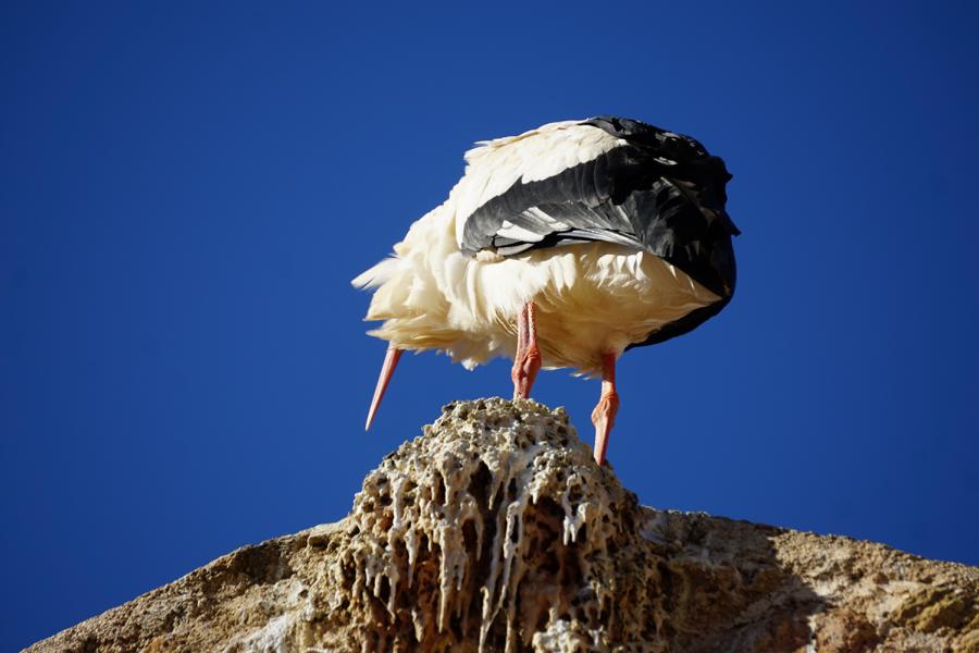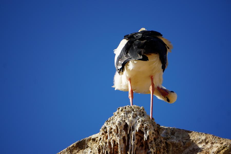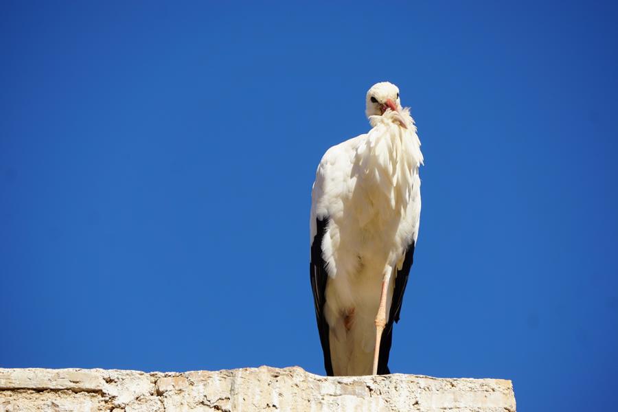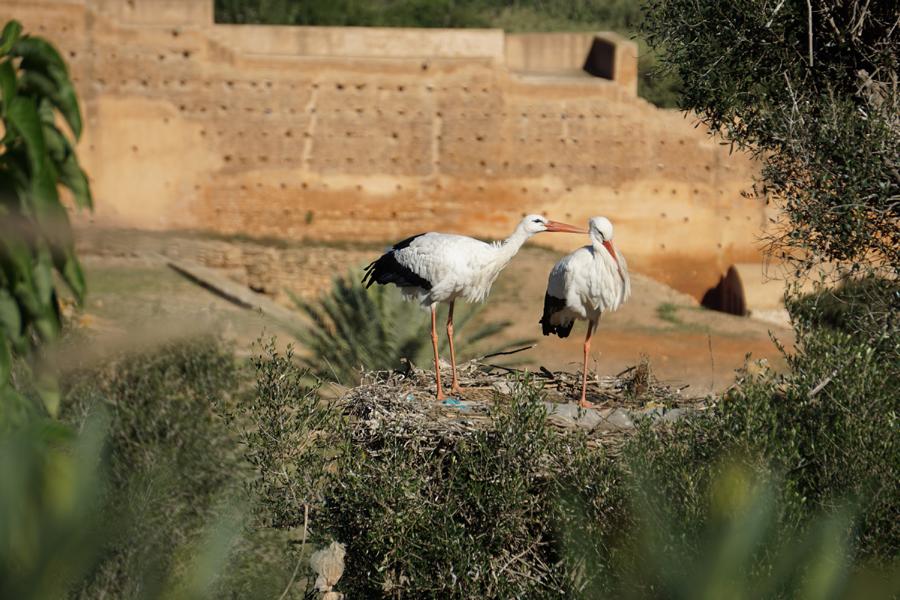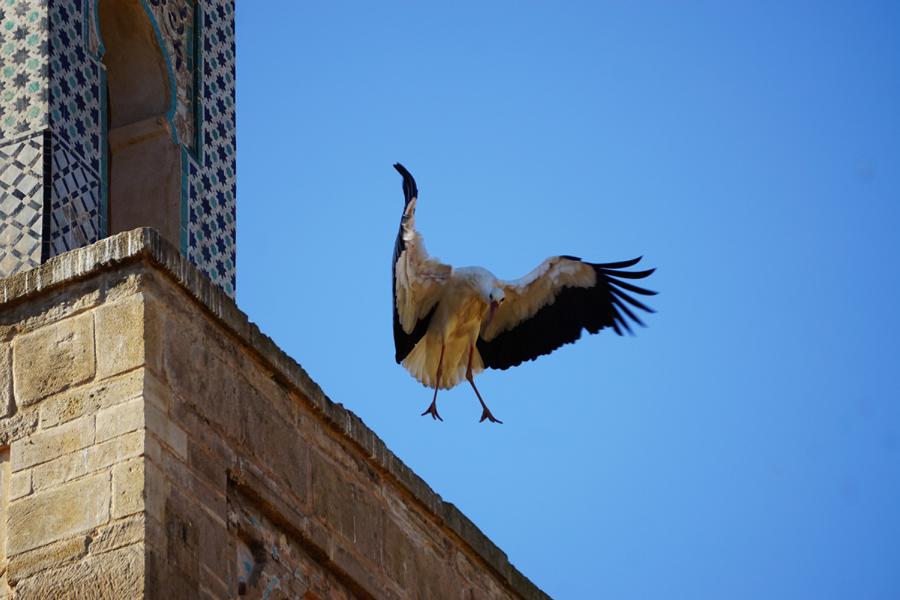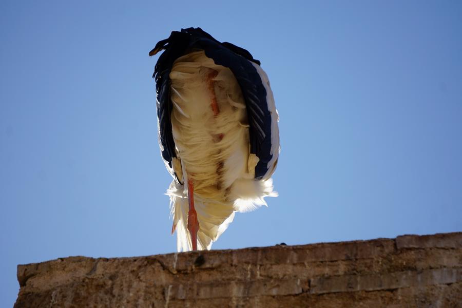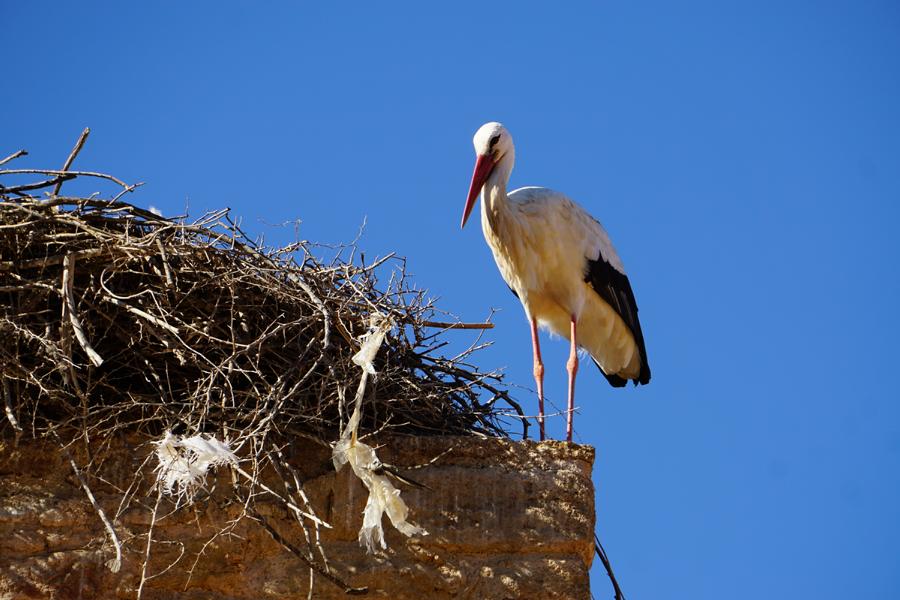 Es gibt ein Restaurant, in dem ich ein sehr leckeres spätes Mittagessen hatte. Dort kann man in der ersten Reise auf Augenhöhe mit den Störchen sitzen. Ganz unglaublich. Nach dem Mittagessen war ich noch im Storchen-Chellah Shop zum shoppen.
