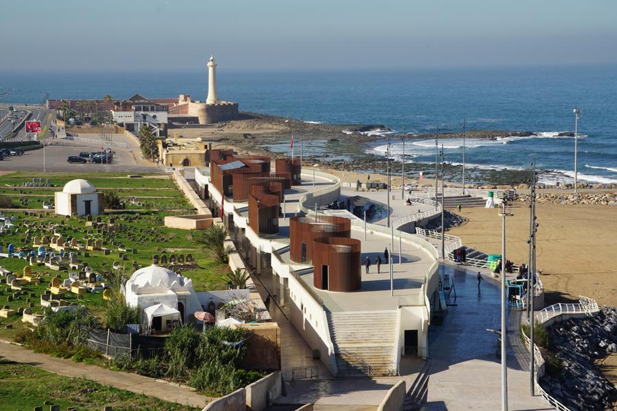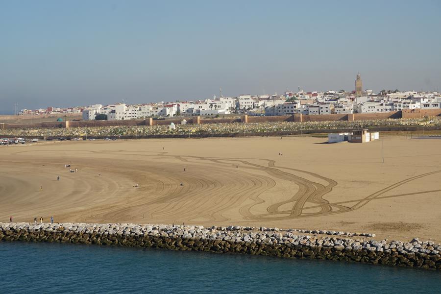 Neugierig war ich auch, deshalb kletterte ich ein paar sehr hohe Stufen hoch, um über die Mauer zu schauen. Blick über den großen Friedhof, den Strand und den Bou Regreg (der hier gerade nicht so zu sehen ist) zur Kasbah des Oudayas nach Rabat.