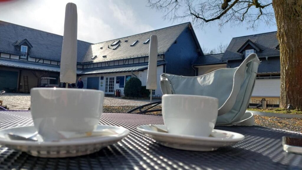 Nachdem ich alles ausgepackt hatte, saßen die A. und ich im Sonnenschein vorm Café mit einem Cappuccino vor uns.