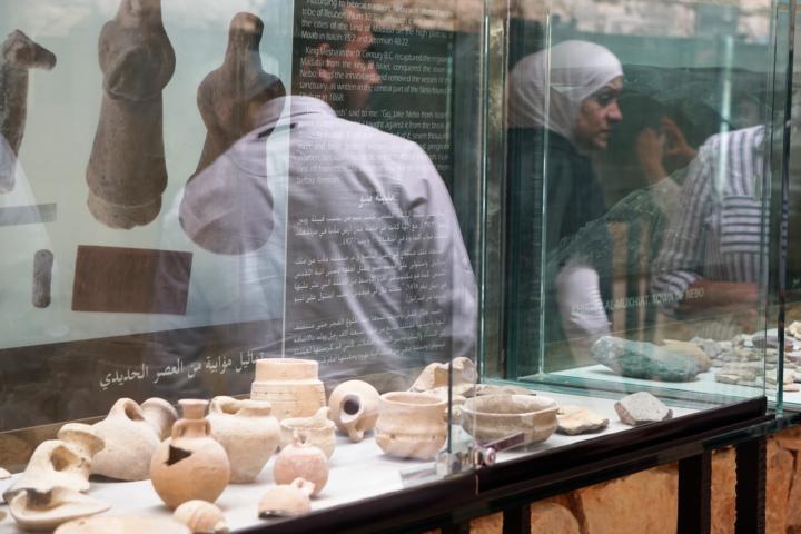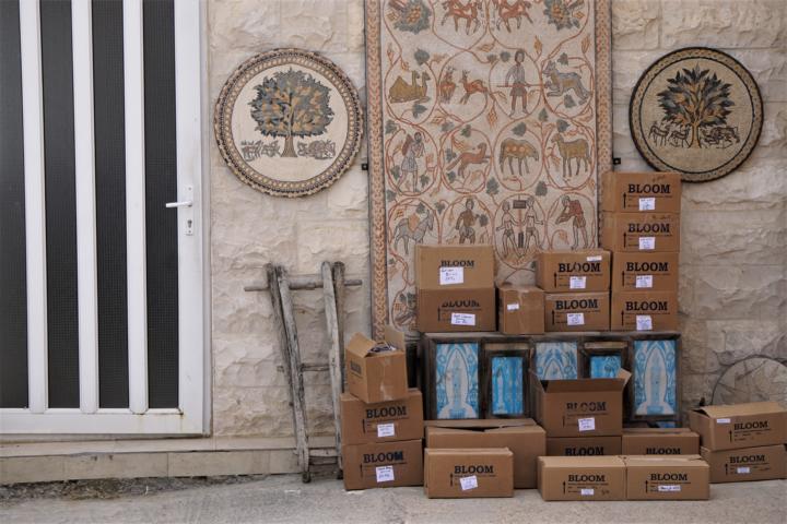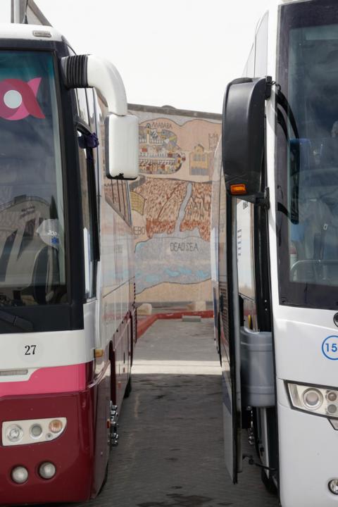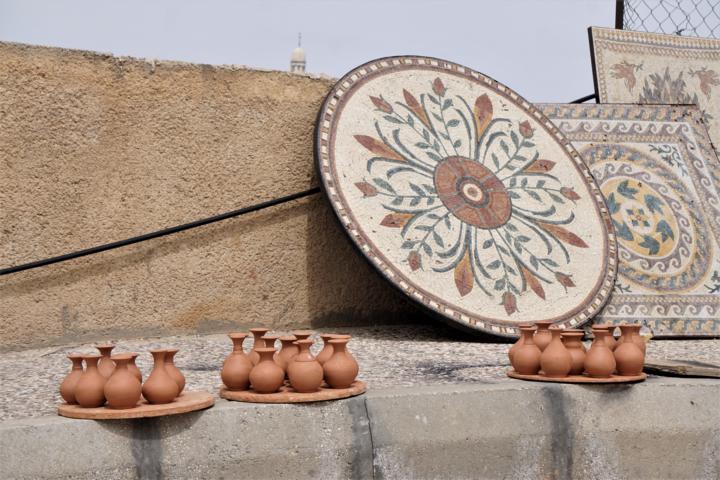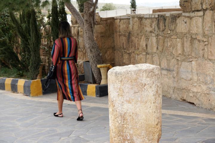 Ich bin um 5:30 aufgewacht. Na sowas. Da lohnt es sich auch nicht mehr sich anzustrengen um nochmal einzuschlafen. Also Yogamatte ausrollen und losturnen, Tee trinken und schreiben, duschen, Sachen packen und, zwar nicht als Erste aber rechtzeitig, im Frühstücksraum sitzen um dann – tata! als Allererste am Bus zu sein.. Das überrascht mich so sehr, dass ich vor Schreck wieder rein laufe, denn ich hab Angst das alle drin auf mich warten. Aber ich hab mir den Platz ganz vorn reserviert und meinen Rucksack dick und breit dort hingelegt. Und dann geht es los. Heute so nach Madaba(ich verlinke jetzt mal die Orte, falls jemand nachlesen möchte was es dort zu sehen gibt). Dort ist eine griechisch orthodoxe Kirche die ich aber nicht besichtige, denn ich brauche Auslauf und es ist mir viel zu voll. Ich frage wie lange die Kirchenbesichtigung dauert und melde mich für die Zeit ab um durch die Straßen zu trödeln. Dabei treffe ich eingesperrte Dromedare.