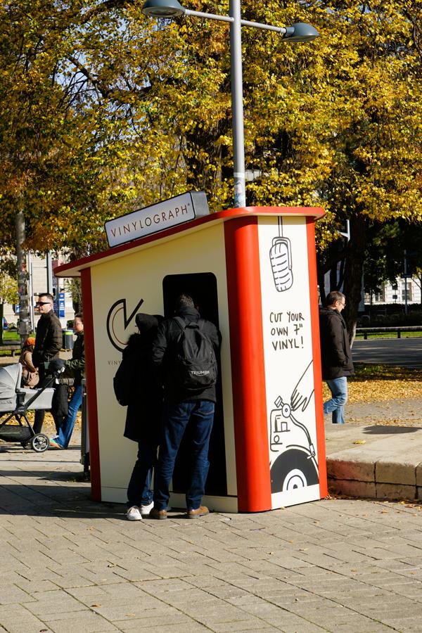 Ich musste erstmal nachschauen, was ein Vinylograph ist. Für alle, die es auch nicht wissen: Ein Vinylograph ist ein Schallplattenschneideautomat, der von Natscha Muhic und Christoph Freidhöfer entwickelt wurde. Man kann singen oder sprechen, und die Tonaufnahmen werden in Echtzeit auf eine 7-Zoll-Schallplatte geschnitten. Es ist der einzige Automat im öffentlichen Raum, der es möglich macht, Schallplatten ohne Tontechnik und Produktionsfirma selbst zu erstellen. Wir hätten also ein schönes Lied singen und anschließend unsere eigene Schallplatte mitnehmen können. Vielleicht beim nächsten Mal.